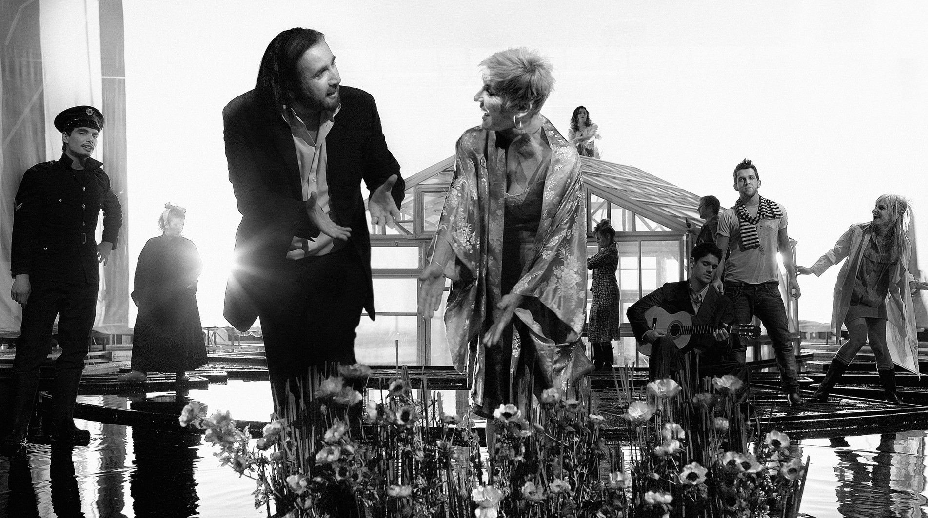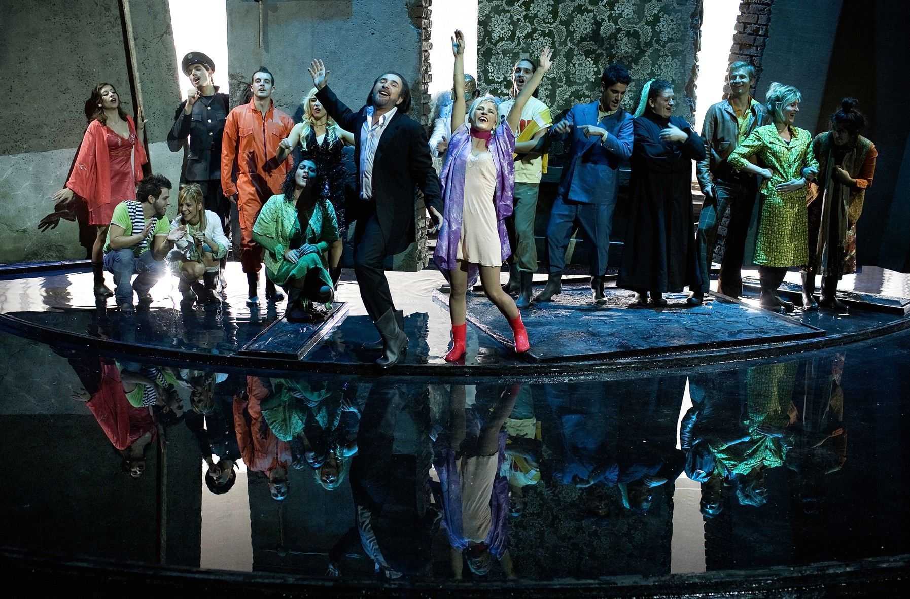 Τα σκηνικά του Γιώργου Γαβαλά, στενού συνεργάτη του Λάκη Λαζόπουλου τα τελευταία χρόνια, μεταφέρουν τη σκληρή πραγματικότητα σ’ έναν υδάτινο κόσμο που κινείται συνεχώς. Ένα μοναδικό σκηνικό στη μεγαλύτερη ίσως θεατρική παραγωγή.