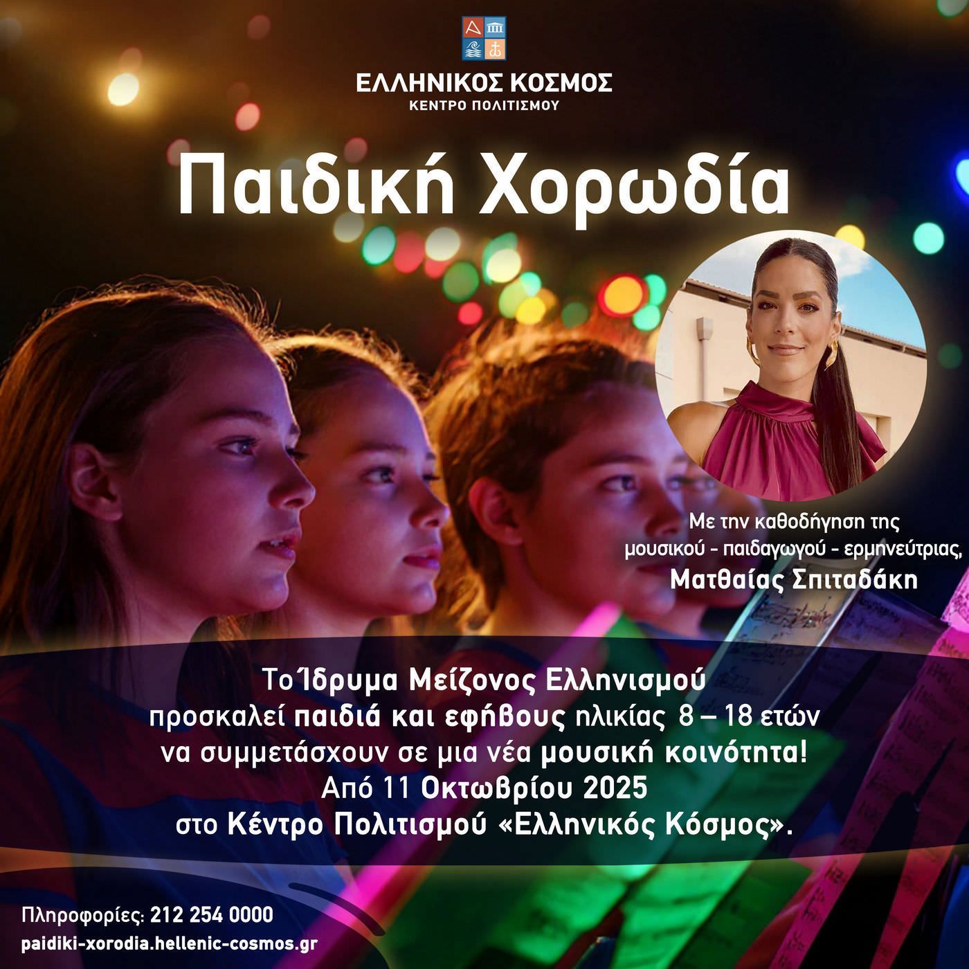 Η χορωδία του Ιδρύματος Μείζονος Ελληνισμού καλεί παιδιά και εφήβους ηλικίας από 8 έως 18 ετών, που αγαπούν τη μουσική να γίνουν μέρος μιας ζωντανής κοινότητας ήχου, έκφρασης και χαράς με την καθοδήγηση της μουσικοπαιδαγωγού Ματθαίας Σπιταδάκη.