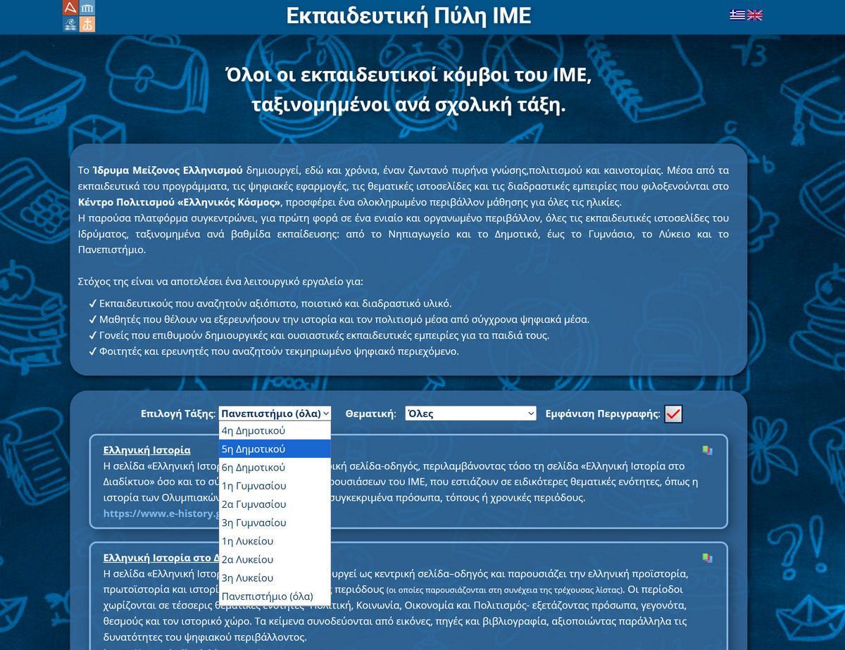 Η παρούσα πλατφόρμα συγκεντρώνει, για πρώτη φορά σε ένα ενιαίο και οργανωμένο περιβάλλον, όλες τις εκπαιδευτικές ιστοσελίδες του Ιδρύματος, ταξινομημένα ανά βαθμίδα εκπαίδευσης: από το Νηπιαγωγείο και το Δημοτικό, έως το Γυμνάσιο, το Λύκειο και το Πανεπιστήμιο.