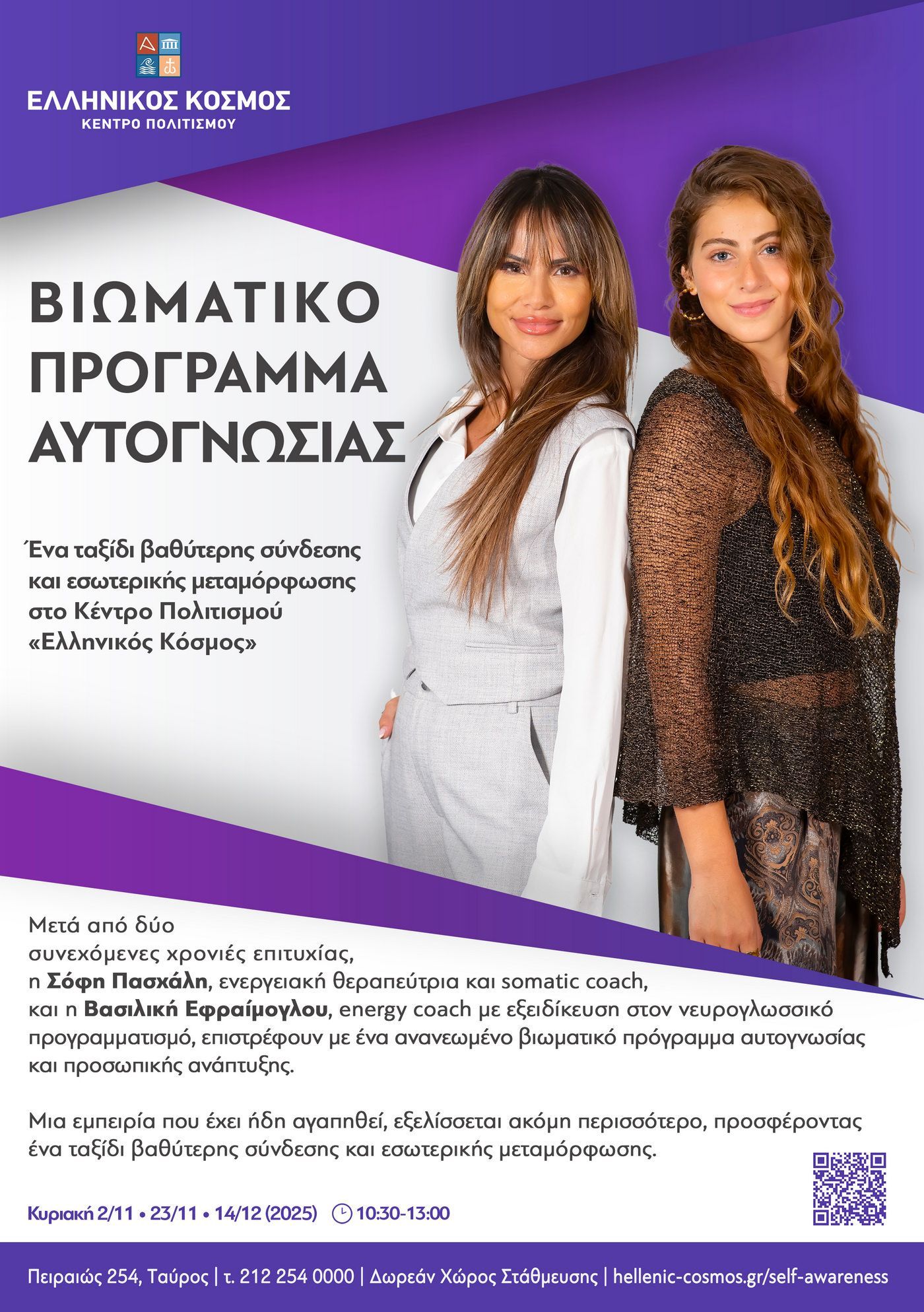 Μετά από δύο συνεχόμενες χρονιές επιτυχίας, η Σόφη Πασχάλη, ενεργειακή θεραπεύτρια και somatic coach, και η Βασιλική Εφραίμογλου, energy coach και ειδική στον νευρογλωσσικό προγραμματισμό, επιστρέφουν με ένα ανανεωμένο βιωματικό πρόγραμμα αυτογνωσίας και προσωπικής ανάπτυξης. Μια εμπειρία που έχει ήδη αγαπηθεί, εξελίσσεται ακόμη περισσότερο, προσφέροντας ένα ταξίδι βαθύτερης σύνδεσης και εσωτερικής μεταμόρφωσης.